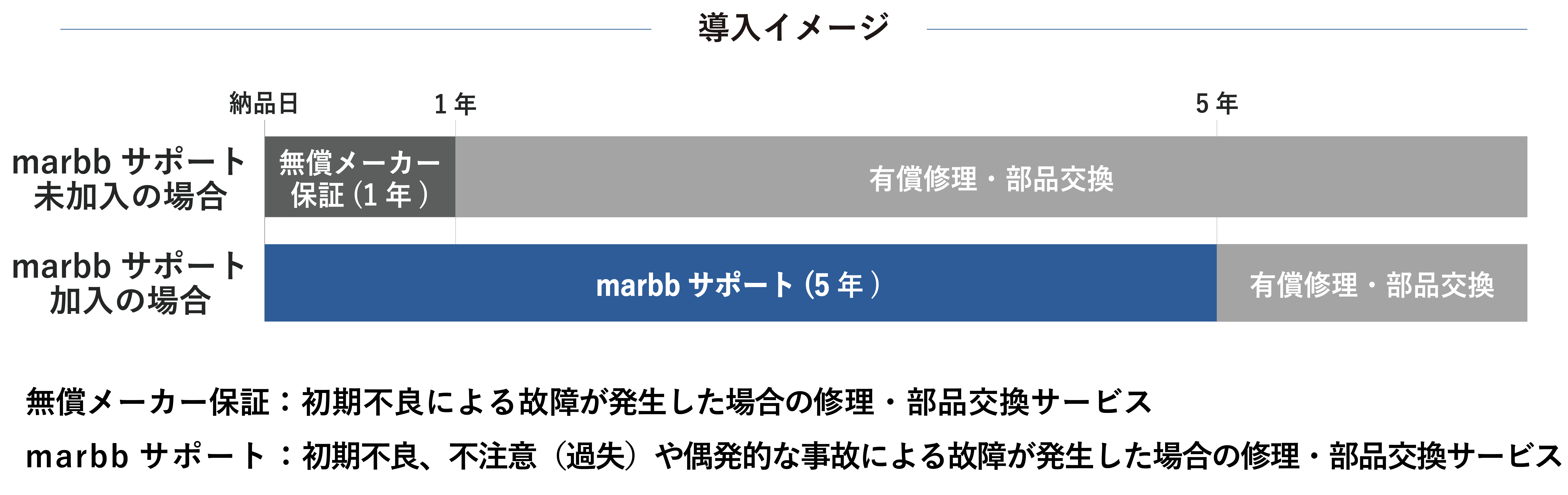 FAQ HOME FAQ Q.保証期間はどれくらいですか? 納品日から5年間になります。 ※5周年特別キャンペーン適用の場合については、キャンペーンページをご参照ください。 Q.marbbサポートに加入した後、途中解約はできますか? 途中解約(返金)はできませんので、あらかじめご了承ください。 Q.どこまで保証されますか? marbbサポートの修理・部品交換サービスでは、初期不良対応はもちろん、不注意(過失)や偶発的な事故による故障*1が発生した場合に修理・部品交換サービスを受けることができます。保証上限は製品購入金額(税別)*2です。 *1 故障とは通常の使用に支障をきたす不具合を意味し、通常使用による摩耗や汚れ、経年劣化は保証対象外です。 *2 製品購入金額は下記のとおりです。 marbbシングル:498,000円(税別) marbbダブル:598,000円(税別) なお、複数台ご導入されている場合は、製品購入金額の総額を保証上限とします。 Q.marbbサポートの対象エリアはありますか? 全国に対応しています。 ただし、北海道、沖縄、離島のエリアに関しては電話対応、センドバック方式(発送修理・部品交換)の対応となります。 Q.1店舗に複数台のmarbbを導入していますが、marbbサポートのサービス料は台数分発生しますか? marbbサポートのサービス料は店舗単位で発生します。1店舗に複数台のmarbbを導入している場合、お支払いいただくサービス料は1店舗分となります。 Q.1つの会社で複数店舗にmarbbを導入していますが、marbbサポートのサービス料はどのように発生しますか? marbbサポートのサービス料は店舗単位で発生しますので、運営主体である会社が1つであっても、別店舗の場合は別途加入が必要となります。 Q.marbbサポートに加入した後、marbbを追加購入した場合は保証を受けられますか? marbbサポートのサービス料は店舗単位で発生しますので、購入したmarbbをどの店舗に導入(納品)するかによって異なります。 ①過去に導入した店舗に追加購入:お支払いいただくサービス料は1店舗分となります。 ※追加購入時の保証期間例をご参照ください。 ②新しい店舗に追加購入:店舗数に応じてサービス料が発生します。 なお、追加購入したmarbbの保証期間は納品日から5年間となります。 Q.どのような支払方法がありますか? クレジットカード決済になります。 なお、決済に関してご不明な点がございましたら、下記窓口までお問い合わせください。 カスタマーサポートセンター受付窓口 ☎ 050-5443-0822 受付時間 平日 10時~17時 ※土日祝日を除く Q.修理・部品交換サービスは、オンサイト方式とセンドバック方式の2種類から好きな方を選べますか? 弊社のスタッフがお客様から状況をヒアリングし、最適な解決方法をご提案いたします。 ただし、北海道、沖縄、離島のエリアに関しては電話対応、センドバック方式(発送修理・部品交換)の対応となります。 Q.marbbサポートに加入できない場合はありますか? marbbサポートは弊社(メーカー)または正規販売店からご購入されたお客様限定のサービスです。 それ以外の販売者からご購入された場合は、marbbサポートの対象外となります。 Q.marbbサポートに未加入の場合、修理・交換費用はいくらかかりますか? 交換部品価格表をご参照ください。 *会員登録後に閲覧できます その他ご不明な点がございましたら、お問い合わせフォームまたは下記窓口までお問い合わせください。 カスタマーサポートセンター受付窓口 ☎ 050-5443-0822 受付時間 平日 10時~17時 ※土日祝日を除く